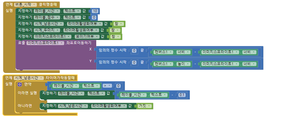 - 사용한 컴포넌트는 레이블, 캔버스, 이미지스프라이트, 버튼, 시계, 소리 입니다.