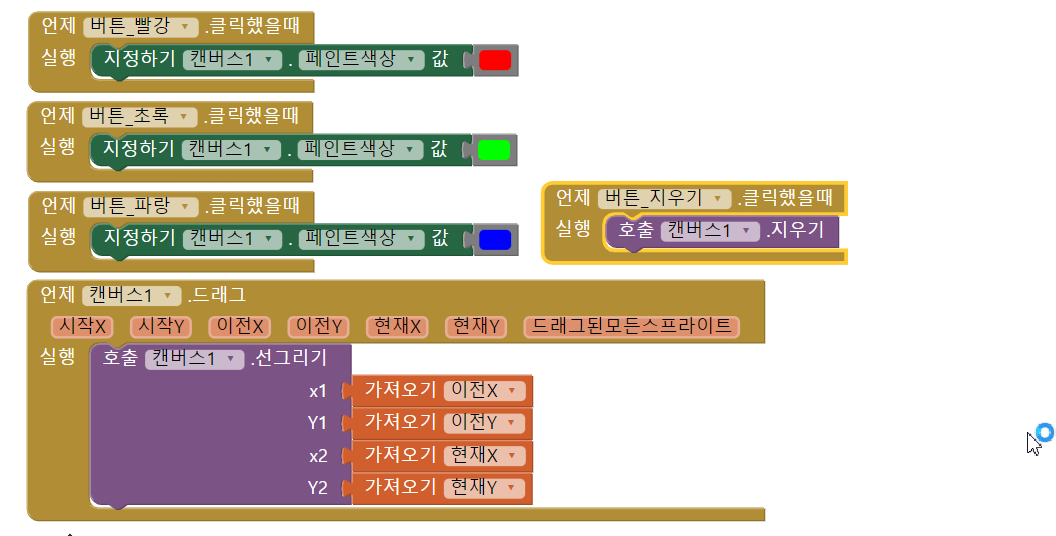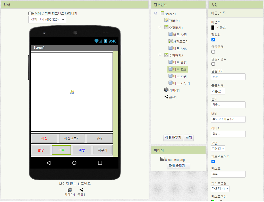 그림핀에 여러가지 색으로 그림 그리기 코딩 (캔버스 컴포넌트)![]() 카메라 컴포넌트를 이용해서 핸드폰으로 사진찍기 ![]() 저장된 사진을 불러오고 그리기 기능으로 편집 후 SNS에 공유하는 코딩 ![]() |
