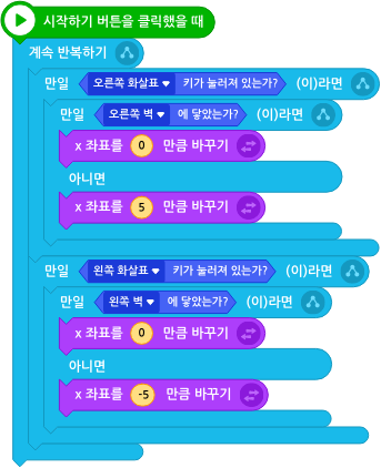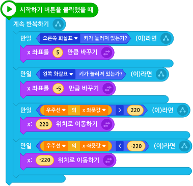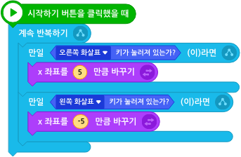 사용 블록 : 오른쪽 키가 눌러져 있는가, x좌표를 ( )만큼 바꾸기