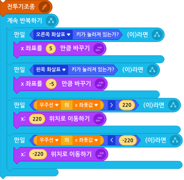 전투기/우주선이 좌우로 움직이다가 만일 벽에 닿았다면 더이상 움직이지 않습니다. 이렇게 블록을 조립하면 전투기/우주선이 화면 밖으로 사라지지 않게 됩니다.