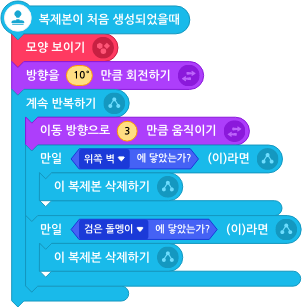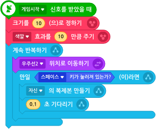복제본의 크기, 색상 등을 설정하면 좀 더 액티브한 게임 오브젝트를 만들 수 있습니다. 스페이스 키가 눌러졌을 때 블럭을 사용하여 복제본을 만들고, [ ] 위치로 이동하기 블럭을 사용해서 미사일 복제본이 우주선에서 발사되도록 위치를 설정합니다.