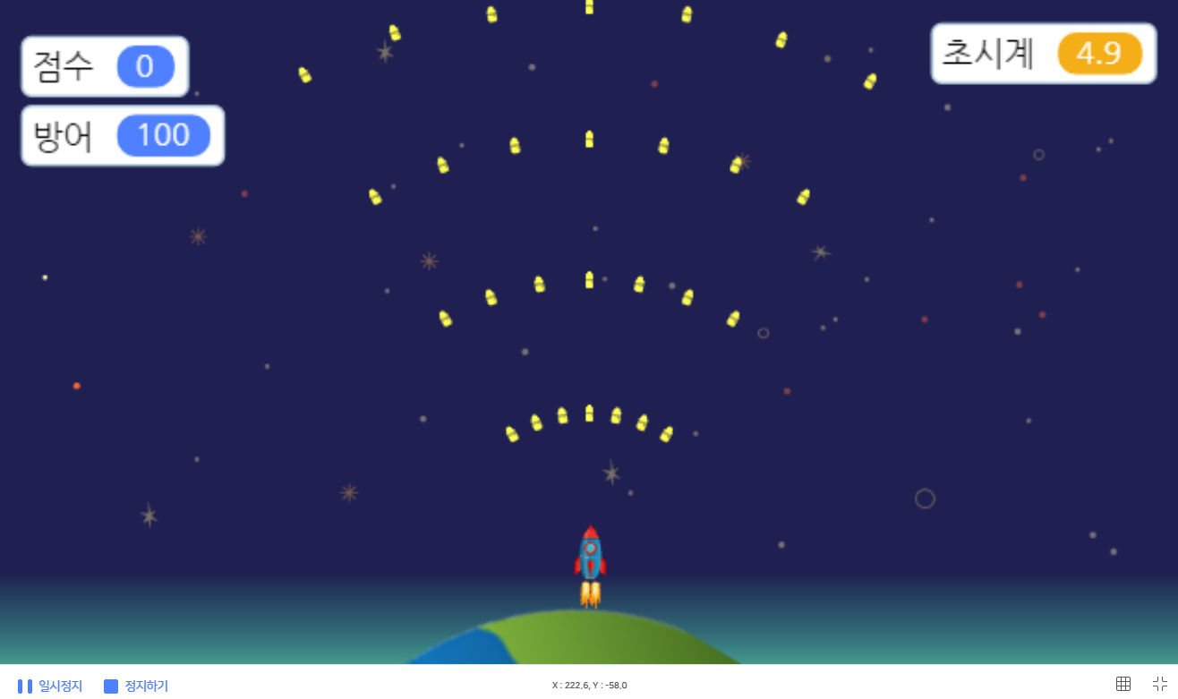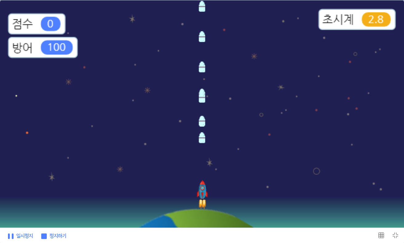 미사일 블록이 잘 조립되었다면 아래와 같이 미사일이 일직선으로 날아가게 됩니다.