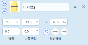 그 다음에는 미사일의 이동방향을 설정하기 위해 방향을 [ ] 만큼 회전하기 블럭, 이동방향으로 [ ] 만큼 움직이기 블럭입니다.