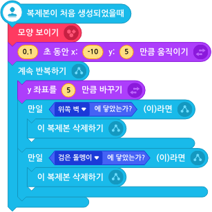 전투기/우주선에서 발사된 미사일은 위쪽을 향해 이동 ( y 좌표 [ ] 만큼 바꾸기 블럭 사용 ) 합니다. 그리고 미사일이 위쪽 벽에 닿은 경우, 소행성에 닿은 경우 삭제되도록 합니다.