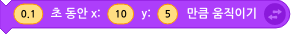 미사일이 전투기/우주선 옆에서 발사되어야 하므로, 복제된 미사일의 위치를 몇 초동안 X Y 만큼 이동하기 블럭을 사용해서 미사일이 발사되는 위치를 만들어 줍니다. 우주선을 기준으로 미사일1은 X : 10, 미사일2는 X : -10 에 위치하도록 합니다.