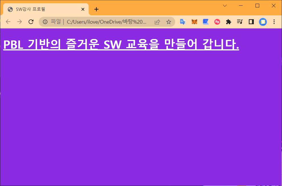 - body { background-color: blueviolet } : body의 배경색에 blueviolet을 적용한다는 의미입니다. 색상을 바꾸고 싶다면 blueviolet 대신 다른 color를 입력하면 됩니다.