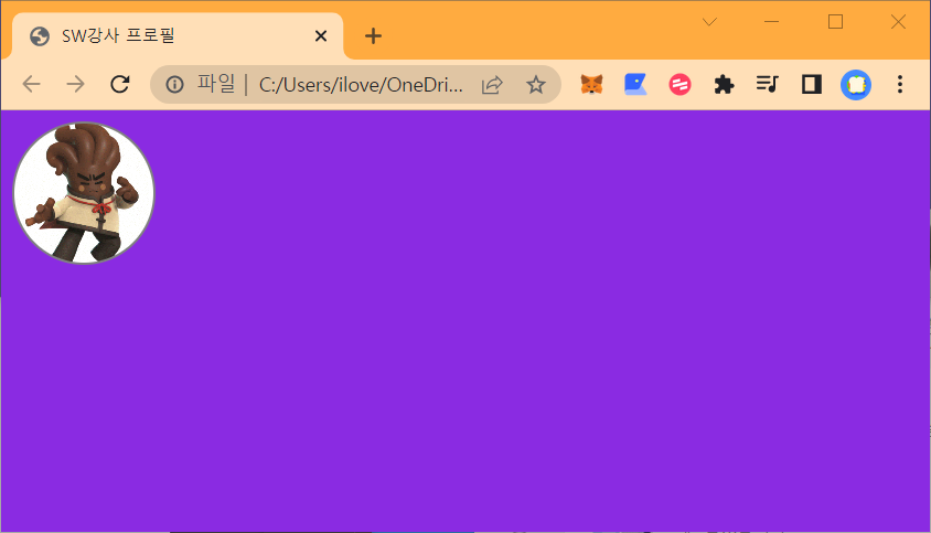 아래 코드를 복사해서 index.html 파일에 넣어주세요. index.html 파일이 있는 디렉토리에 프로필 이미지를 넣어주세요. 예제 이미지 파일을 다운로드받아 테스트해 보세요. < 프로필 이미지 파일 다운로드 >