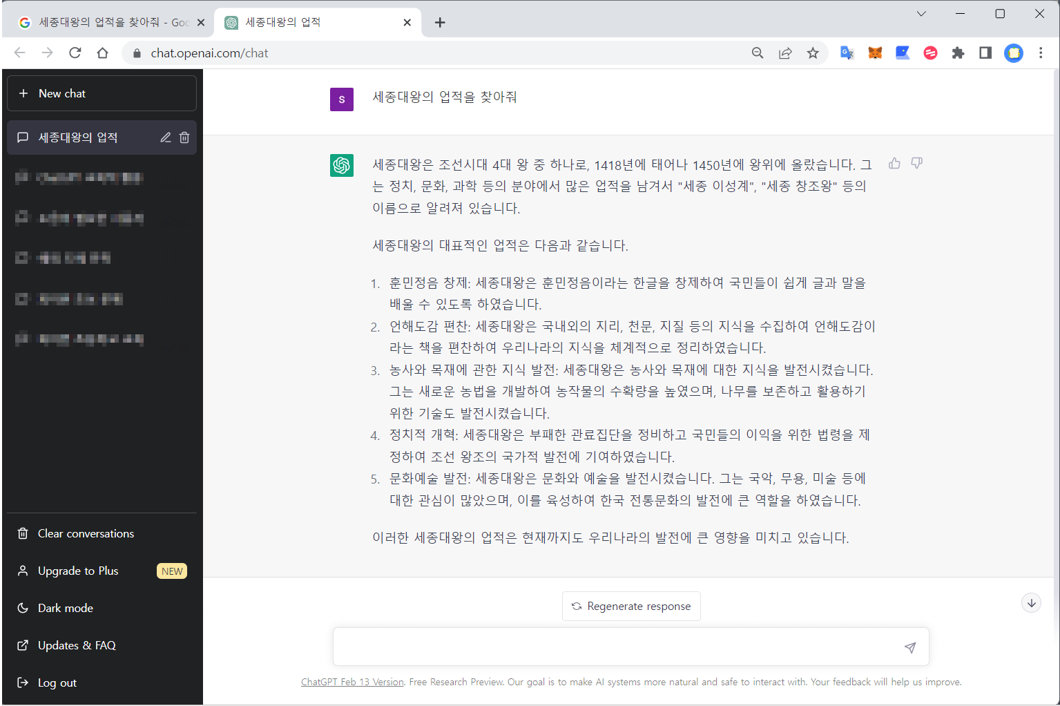 초등학교 3학년 수업에 나오는 "세종대왕의 업적"에 대한 정보를 알아보기 위해, Google과 chatGPT에 각각 "세종대왕의 업적을 찾아줘" 라는 질문을 했습니다.