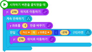 시작하기 버튼을 클릭했을 때, 우주1 오브젝트의 위치는 y : 270으로 합니다. 그리고 우주 오브젝트와 마찬가지로 y좌표로 -2만큼씩 이동 하다가, 화면을 벗어나면 화면 위로 이동하게 합니다.