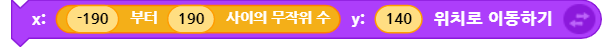 소행성 복제본이 화면의 윗면 바깥 쪽에서 자연스럽게 떨어지도록 하기 위해서 움직임 - x y 위치로 이동하기 블록을 사용합니다. x 값은 화면 내에 무작위로 나타나도록 - 190 ~ +190 사이의 값을 입력하고, y 값은 소행성이 화면 밖에서부터 떨어지도록 140 이상의 값을 입력합니다.