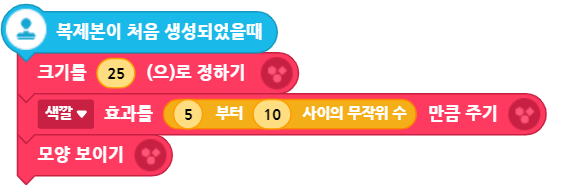 소행성 복제본이 생성되면 숨겼던 이제 복제본이 보이도록 설정하고 크기와 색상을 변경해서 다양한 복제본을 만들어 줍니다. 모양보이기는 생김새-모양보이기 블록을 사용하고, 복제본의 크기는 생김새-크기를 [ ]로 정하기 블록을 사용합니다. 소행성 색상을 랜덤하게 표현하기 위해 생김새 - 색깔효과를 [무작위수]만큼 주기 블록을 사용합니다.