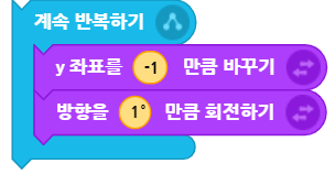 소행성은 화면의 위쪽에서 보이지 않는 곳에서 아래쪽 벽으로 떨어지도록 코딩을 합니다. 우선, 소행성이 계속 떨어져야 하기 때문에 계속하기 블록에 y좌표를 [ ] 만큼 바꾸기 블록을 넣어서 소행성이 반복해서 아래로 떨어지도록 만듭니다. 이때 y좌표의 값은 속도를 의미합니다.