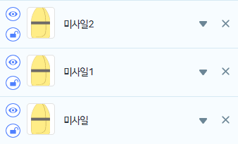 먼저 미사일 오브젝트를 복제해서 미사일 1, 미사일2 오브젝트를 만들어 줍니다.