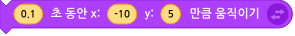 미사일이 전투기/우주선 옆에서 발사되어야 하므로, 복제된 미사일의 위치를 몇 초동안 X Y 만큼 이동하기 블럭을 사용해서 미사일이 발사되는 위치를 만들어 줍니다. 우주선을 기준으로 미사일1은 X : 10, 미사일2는 X : -10 에 위치하도록 합니다.