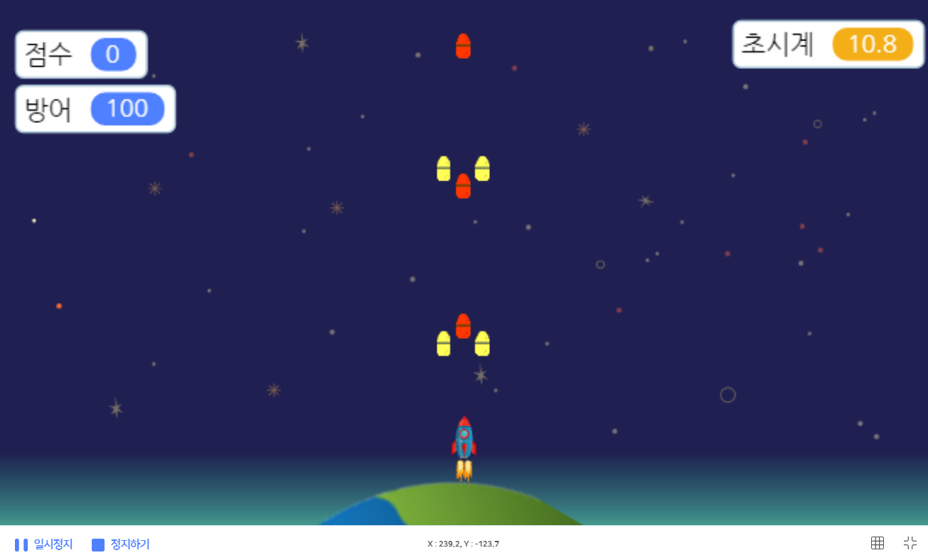 미사일 블록이 잘 조립되었다면 아래와 같이 미사일이 일직선으로 날아가게 됩니다.